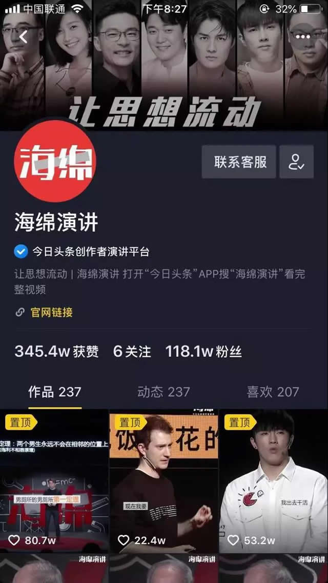 和以往的演讲不同,海绵演讲发起、录制到成品的所有过程,一来源于用户的需求又反哺回有相同兴趣的海量用户,二来保证头条系全域精准沟通,不浪费一丝一毫的预算和流量。 从前5场来看,海绵演讲的效果非常惊人,活动内容累计曝光超5亿,演讲视频总播放量超1.5亿,今日头条端内相关话题获得近3亿阅读和超2万讨论,抖音短视频累计点赞达340万。