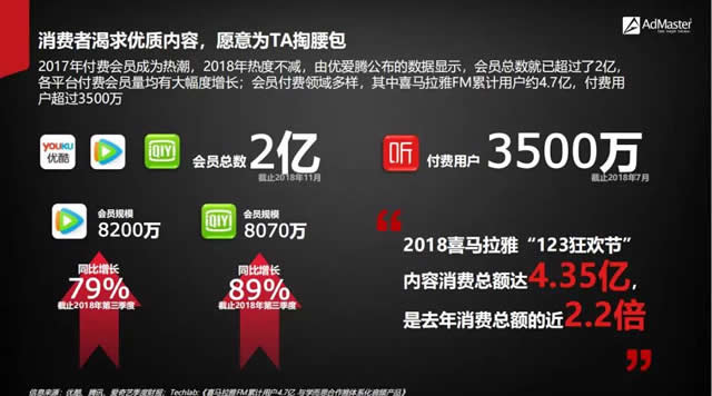 细分圈层后,找到合适的语言与之沟通就成为重头戏,而优质内容无疑是重要切入口。 空口无凭,数据为证。截至去年11月,优爱腾会员总数破2亿;去年7月,喜马拉雅付费用户超3500万,为优质内容付费已逐渐成为用户共识,并且他们正在由焦虑性付费向兴趣性付费转变。