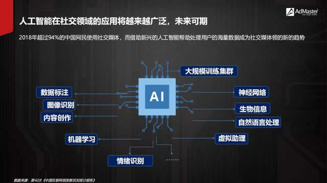 智选代言人,甄选KOL和平台,品牌就能撬动营销杠杆,四两拨千斤。 借力人工智能,营销主脑持续助攻 阿丽塔有战斗心脏,机器人有主脑,社交和内容营销要想持续发力,也必须有它的“指挥中枢”,而人工智能正在逐渐承担这一角色。 数据显示,2018年超94%的中国网民使用社交媒体,海量数据产生。而AI的强大识别、学习、处理能力,让其在社会化营销领域大有可为。