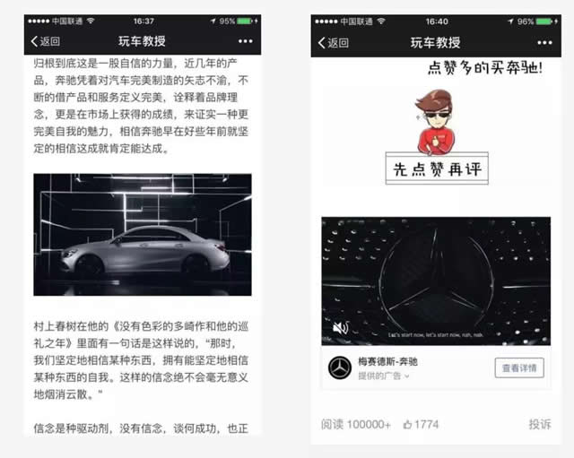 图片来源:腾讯广告公众号 广告主经常有这样的困惑,到底哪些号的内容是最好的?或者说最适合我的,转化率如何?性价比如何?甚至排期都会是品牌所要牵肠挂肚的。于是越来越多的品牌选择直接互选广告,奔驰就是其中之一,与玩车教授的跨界合作,不仅带来8%的平均点击率、56%的相关评论,并将“心所向,驰以恒”的品牌主张通过别开生面的嘻哈视频触达了更多粉丝人群。