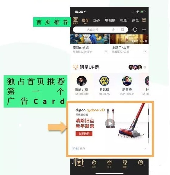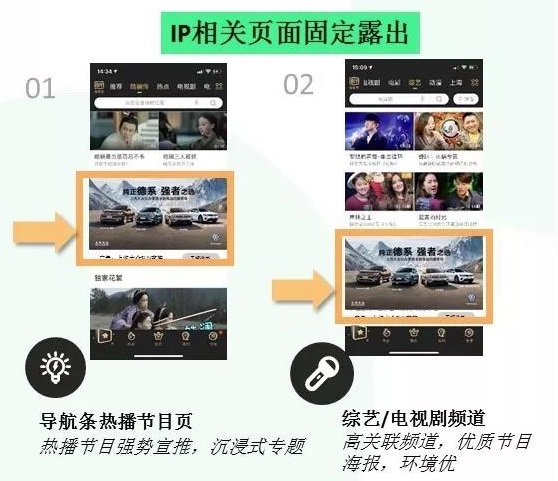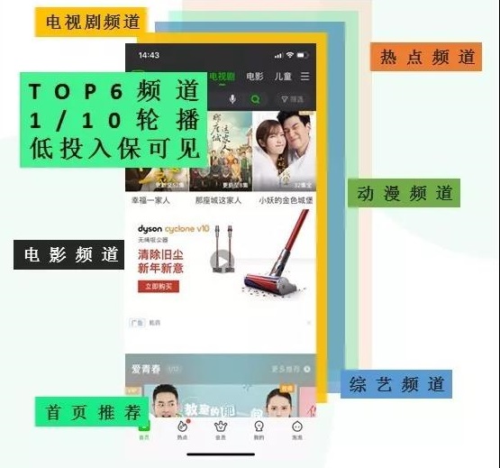 广告优势: 1.广告结合超品提升贴片reach,广告VIP可见,支持超长视频,加时长不加价。 2.广告展现于移动端,CPD占比。 3.广告展现于各频道页中,并且广告是在TOP6频道中,进行1/10轮播,这里的广告投放低投入保可见。 6、IP打包