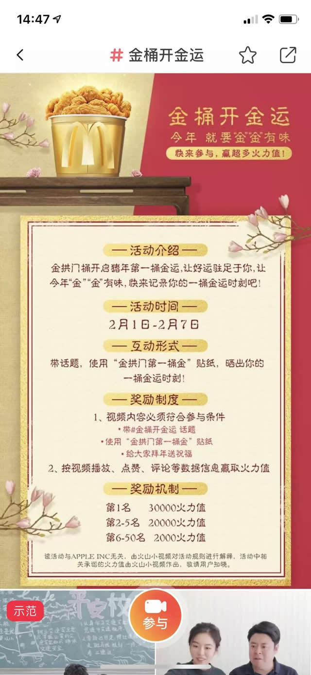 今年的春节营销季,火山小视频与麦当劳合作了一场“金桶开金运”挑战赛,向用户征集“贴纸”创意视频并提供奖励激励,通过契合节日气氛的创意表达与新线人群实现了高互动量与大量二次传播。