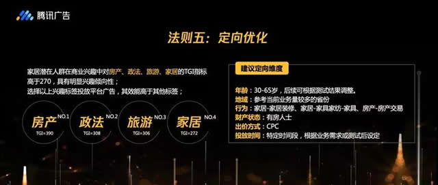 法则五:定向优化 腾讯通过LBS位置服务、腾讯数据智库(TDC)等数据能力的打通,能为品牌洞察用户、挖掘潜在消费群体。如:在家居行业潜在受众中,通过腾讯数据的分析能为品牌定向房产、政法、旅游、家居等具有明显兴趣倾向的人群。通过明确兴趣人群后,腾讯再协助品牌选择相应的平台进行广告投放,为家居品牌创造优异的投放成效。