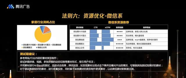 法则六:资源优化 结合微信、QQ、视频、新闻等核心流量资源,腾讯为品牌深度绑定受众互动。腾讯了解品牌在测试期间能够获取高流量位置、在投放效果稳定后再进行规模投放的诉求。因此,为协助品牌创造最佳投放效果,腾讯也针对不同投放渠道,推出不同优化解决方案。 a.微信系:腾讯微信朋友圈、公众号广告投放在广告成本方面较有竞争力,相对也较容易获得高曝光量与互动量。因此,三宫格、六宫格、九宫格等原生朋友圈广告形态,不仅为品牌提供了更美观的投放展现形式,也有效地将素材和着陆页统一,从而进一步提高用户的互动性与留资意愿。