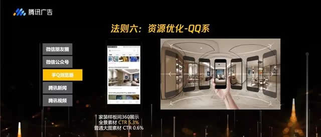 通过QQ系的全新形态全景广告,可以让用户转动手机,就能够360度看到家居装饰效果图。成果对比说明,全景广告CTR相较普通大图提升至5.3%。由此可知,全景看房、VR看房的全景广告形式未来将是家居行业的一个大趋势。