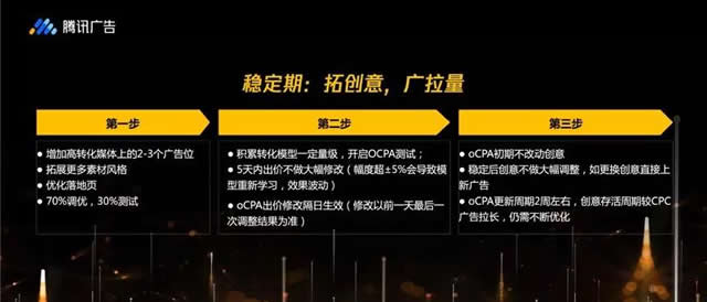 2、稳定期:拓创意,广拉量:为品牌提供优化建议 “黄金七法则”适用于品牌广告投放的测试期,而在投放稳定期,品牌应通过既有的运营技巧获得更多的流量、创造更多的用户转化。对此,腾讯为广告主提供了“oCPA测试”,为品牌寻找高潜在转化用户,并针对投放提出有效的建议。