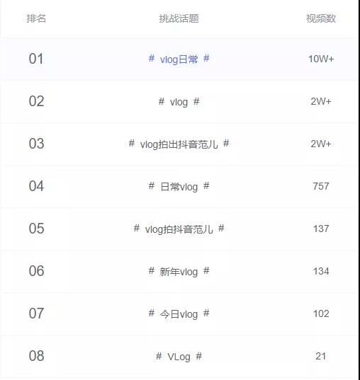B站“30天Vlog挑战活动”参与Vlog示例 今日头条与欧阳娜娜的展开的首个明星Vlog计划,获得巨大成功,让头条系察觉到了Vlog潜在的影响力。 2018年12月,抖音内测长达5分钟的长视频,尝试拓宽PUGC内容的生产模式,支持机构、大V等进行Vlog和短剧等形式的创作,以期增加用户粘性。 根据追踪,抖音中# Vlog日常 #挑战话题的视频数已经达到10W+,# Vlog #和# Vlog拍出抖音范儿 #话题的参与视频量也达到2W+。