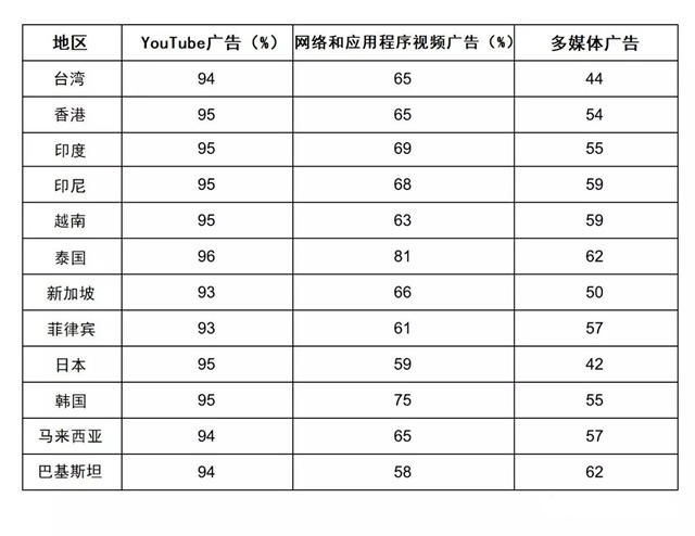 为了进一步了解广告在不同网站和应用程序上的可见度(Viewability)变化,这份数据报告针对 Google Active View 技术的特定多媒体广告和视频广告平台进行了分析。以下将呈现几项可见度的基准来评估多媒体广告和视频广告可见度的相关因素。 了解不同地区和产业的广告可见度 要触及您的目标对象,YouTube 的广告始终在业界领先。纵观全球的网络和应用程序,在 YouTube 上放送的视频广告能拿下高达95%的可见度,遥遥领先任何其他网站或平台的 68% 视频广告可见率。而多媒体广告则只有一半的曝光机会。 YouTube 的广告可见度在全球业界持续保持领先 亚洲地区的可见度表现