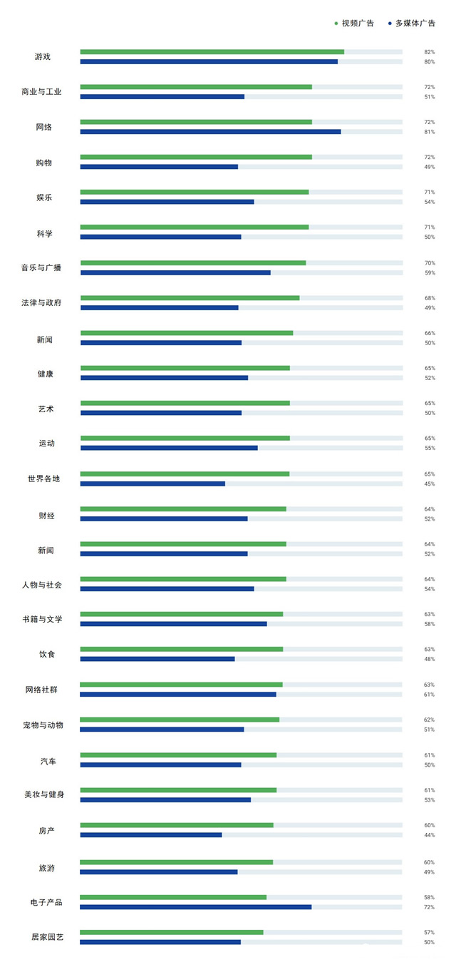 可见度不只因地区而异,也因产业而有所不同。拿下最高可见度的产业,不外乎是能善加利用精彩内容抓住使用者目光的产业,例如游戏,电子产品,音乐及广播等。当中某些产业就连多媒体广告也能拿下极高的可见度,这也反映出使用者普遍对这些内容类别的广告较感兴趣。 提供精彩内容的类别,往往享有较高可见度 不同内容类别的可见率