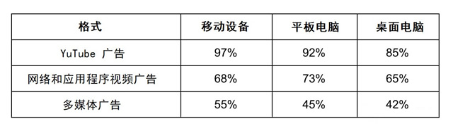 如何制作可见度更高的广告 影响视频广告可见度的因素有很多,尽管当中有些因素比较难以改变(例如地区和产业),但您还是可以透过许多方式来提高广告的可见度。以下列出两个秘诀,供您用作参考使用。 (1)为移动设备优化 除了消费者观看广告时的所在地点以外,他们使用什么设备也是影响广告可见度的一大要素。整体来看,视频和多媒体广告在手机及平板电脑上的可见度表垷大幅超越桌面电脑。 不同设备的可视度