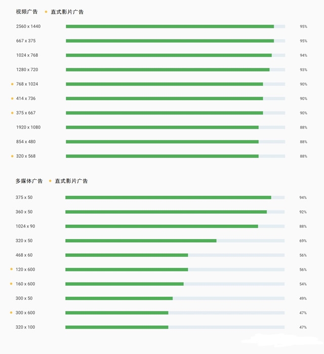 (2)广告大小和比例非常重要 视频广告的大小是致胜的关键。从数据来看,广告越大效果越好。大型影片的播放明显拥有更高的可见度,而直式影片的可见度也高于平均值。 常见广告大小的可见度