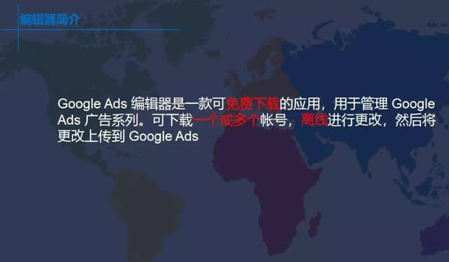 Google Ads 编辑器是一款可免费下载的应用,用于管理 Google Ads 广告系列。可下载一个或多个帐号,离线进行更改,然后将更改上传到 Google Ads。编辑器的主要用途是: 1、使用批量修改工具快速进行多项更改 2、2、同时管理、修改和查看多个帐号 3、在多个广告组或广告系列中搜索和替换文字 4、在广告组之间或广告系列之间复制或移动各种内容 5、在修改广告系列时撤消和恢复多处更改 使用编辑器上传广告方案