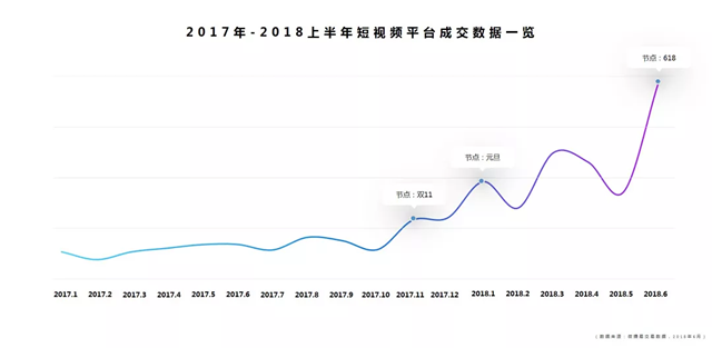 从表中可以看出,快手和抖音两大平台引领中国短视频行业。短视频一梯队中快手位列第一,头条系占三席,抖音引领增长。 2、数据细分,秒懂短视频市场表现的规律 (1)短视频交易额持续走高,年度投放趋势与社会消费节点趋势一致,全年高峰出现在11月-12月及6月