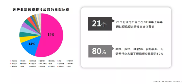 (2)全行业广告主,进入到短视频营销时代,美妆日化与3C数码两大行业贡献了短视频广告68%份额