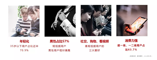 经过对比2017年和2018年的品牌营销走向,发现均出现了不同程度的增减,其中,短视频/直播的增幅高达2.8倍,相当引人注意,成为2018年投入增长最强劲的营销类型。 2、短视频用户画像:哪些人活跃在短视频平台上? 短视频各方面的数据如此“惊人”,究竟有哪些人群在为短视频疯狂打call?这些用户又有哪些特点呢?