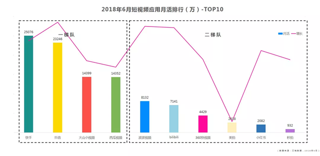 二、Top10短视频平台“花落谁家”,三方面分析看清其综合表现 短视频异军突起,攫取了用户绝大部分时间。各大巨头混战的2018上半年,有哪些短视频平台“突出重围”,顺利挤进了TOP10呢? 1、两大梯队,短视频应用平台TOP10“一览无余”