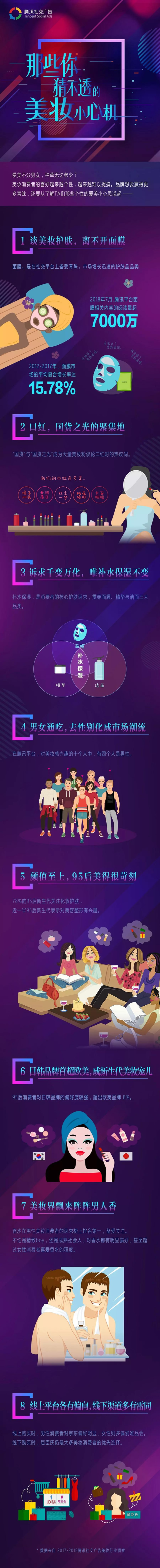 看脸时代,颜值当道。越来越多的消费者为了“面子”,不惜为美妆产品一掷千金。随着消费需求和市场品牌的多元化,消费者对产品和营销需求的个性化趋势越来越明显,洞察并理解消费者,成为美妆品牌面对的重要挑战。 在8月30日举办的“大美所趋,大数所见——腾讯社交广告美妆行业营销峰会”上,腾讯社交广告带来了一份基于市场和社交数据的《美妆行业数据洞察报告》。这里面不仅有行业现状与趋势分析,更透过社交洞察,让美妆品牌重新认识那些盘踞在社交平台上的“衣食父母 美妆市场未来充满潜力 过去5年间,中国美妆市场增速居全球首位,至2017年已成为仅次于美国的全球第二大美妆市场。 在细分品类方面,护肤品的市场规模和增速都高居首位,其中尤以面膜类产品的增速最高,其消费频次不断提升,带动了品类的快速崛起。 同样保持高速增长的还有彩妆类产品,但相比整体人均美妆消费金额,彩妆消费的占比较低。随着互联网社交催生颜值经济,及整体经济形势下的“口红效应”,预计彩妆品类有着巨大增长空间。 欧美品牌占主流,本土品牌不断成长 欧美品牌市场占有率一直保持领先,但在2012年达到顶峰后开始逐年下降。本土、日韩品牌的份额则保持增长态势。 欧美品牌、日韩品牌和本土品牌的定位各有差异,且都拥有独特的优势,彼此之间基本不存在替代关系。 需求个性化、渠道多元化成为趋势 市场环境和消费需求的变化,催生了美妆行业未来发展的新趋势: 1、消费升级持续驱动下,高端化趋势明显 中高端产品增速高于大众产品,占比不断提升。 2、业集中度下降,个性化带来品牌新机遇 消费需求和市场品牌在过去10年间不断趋于多元化,跨境电商引入国外小众品牌,社交媒体成为新生品牌发展的土壤。个性化需求推动了新品研发上市的加速,彩妆类产品尤为明显。 3、电商、美妆专卖店保持增长,打破百货商超的绝对优势 渠道多元化趋势明显,电商、专卖店占比保持增速。 社交平台成为用户交流主阵地,曝光“别样”需求 消费者非常乐于以评论的方式对腾讯平台上的美妆内容进行讨论,且讨论的数量往往和其市场表现挂钩。例如腾讯平台上声量最大的面膜类产品,增速也高居首位。 通过对社交数据的分析,往往也能获得更深刻的消费需求洞察,甚至了解一些“不为人知”的消费偏好: 1、在腾讯平台,每十个对美妆产品有兴趣的人里,有四个是男性; 2、补水保湿的诉求,贯穿面膜、精华、洁面,都是首要需求,可谓补水恒久远,保湿永流传; 3、95后对日韩产品的偏好高于占据市场主流的欧美产品——除了相对欧美品牌较低的价格之外,二次元文化或许功不可没。