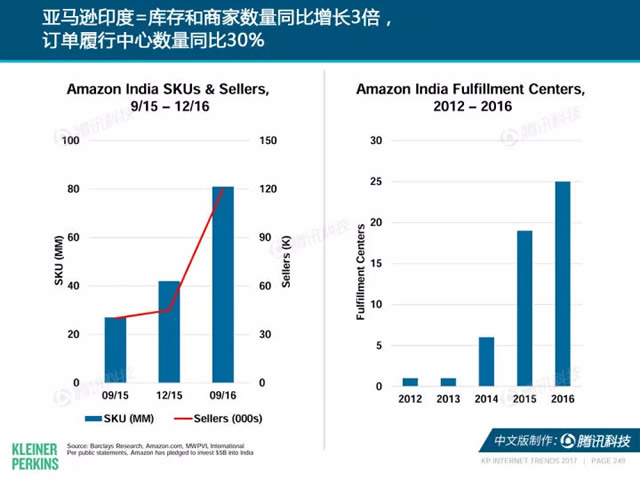 印度:网购流行,市场庞大 随着互联网在印度的流行,“网购”行为也变得越来越普遍,就连许多印度本土零售商也纷纷转战网店经营。 2016年,印度就有超过六千万网民进行网购,总体网购消费金额较前一年翻了一倍,预计到2020年,网上销售额可达600亿美元,跨境电商可不要错过这个蓝海市场。 以亚马逊印度为例,其库存和商家数量同比增长3倍,正处于网购红利期。