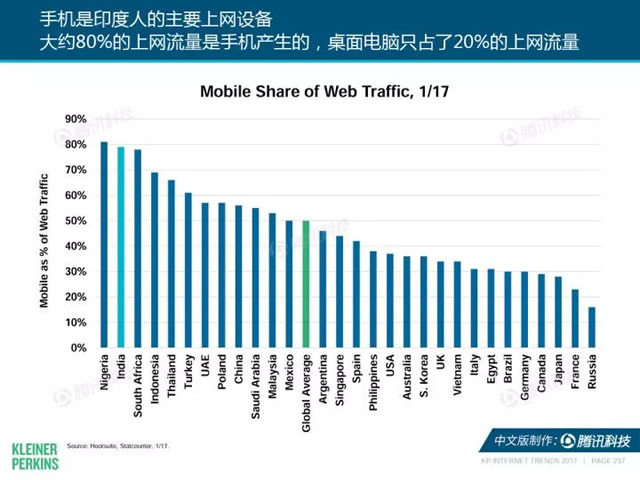 印度:海外推广重点是移动端 上文说过,印度是直接跳过PC互联网时代进入移动互联网时代的,所以在PC端与移动端流量分布上,差距悬殊。 数据显示,80%的流量分布在移动端,因此外贸企业在做印度海外推广时,要将重点放在移动端上,移动自适应站、手机独立站都做起来,不要忽视这个占比最大的流量入口。