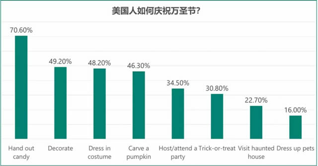 72%的美国人计划加入 2018 万圣节的庆祝行列,他们会选择何种庆祝方式?(NRF) 服饰、装饰品和糖果在万圣节支出中占比最高(NRF) 庆祝方式上,派发糖果、装饰房间、乔装打扮、南瓜灯手工、举办或出席派对等常规操作仍然是多数人的选择;因此对应到消费品类占比上,服饰、装饰品和糖果也以明显优势位列万圣节最主要支出项。