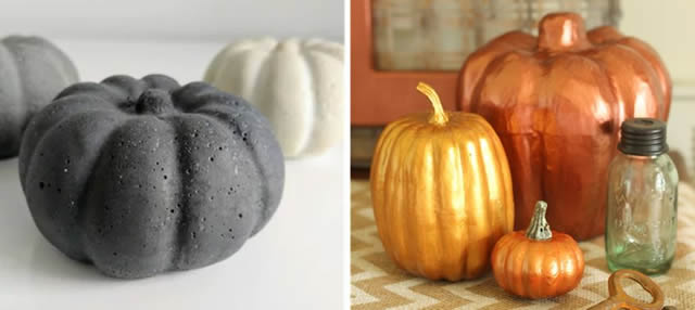 超级马里奥明年要上大荧幕,万圣节备货押一注吗? 2.Decorations 南瓜灯、蜘蛛网、黑蝙蝠、蚊帐小幽灵自是不变的经典,但想到节日过后只能堆放在储藏室的角落,未免有点儿可惜。如果一件器物既能装点节日氛围,又能在日常生活中发挥功用,相信会有很多消费者被其性价比吸引。下面两个例子,可能会给你一点儿启发: a.让南瓜的“保质期”久一点儿 作为一种农作物,南瓜在形态上的可塑性实在出类拔萃:工业风、金属风都能驾驭自如。以下方左图中的 chic-industrial-style 南瓜为例,既有工业风的极致“摩登”,又与万圣节的传统内涵(凛冬将至,亡魂归来)十分匹配:凛冽,坚硬,线条分明。混凝土的质地,黑白灰的色泽,能够有机结合到现代化的家居装潢中去,摆上几年都不成问题,减少了节日造成的浪费。
