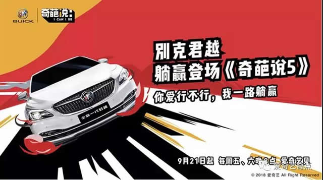 别克在这条探索年轻人内容营销的道路上也颇费了一番功夫,为了迎合受众关注的热点,别克需要寻找高话题度、高传播度的IP进行合作。 作为爱奇艺的长寿网综《奇葩说》已连续开播五季,衍生节目如《奇葩来了》、《奇葩大会》等均叫好又叫座,节目中的人气选手和辩题,往往能成为年轻人茶余饭后热议的谈资。从关注度和影响力上看,“奇葩”可以说是一个相对成熟且成功的IP,更是受年轻人追捧的热点。 别克正是看准了奇葩IP的商业价值,在2018年展开了一系列和“奇葩”内容合作,并且另辟蹊径的与奇葩们一起共创内容,让品牌和IP相辅相成。接下来我们就着重看一下,别克是如何一路玩转“奇葩”。 成功试水,开启奇葩合作之路 今年2月,别克赞助爱奇艺《奇葩大会2》,节目中“别人开车我开挂”的品牌魔性slogan被马东花式玩转,让人冷俊不禁。紧接着,别克又携手衍生节目《奇葩去哪儿》,在节目中将别克君威GS定位为“特别人类座驾”,再次激发年轻人关注。