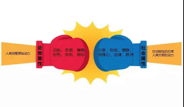 孤阳不生,独阴不长,任何事物离开对立面都无法存在。人性必须了解,但不是静态的了解,单纯研究人性的贪婪、自私、懒惰是没有用的,单纯的研究生存需求、安全需求也没有太大意义。更要看人性的冲突。 人是社会动物,这里面包含着人性的最大冲突,即动物性和社会性的冲突。 人的动物属性,决定了人的自私、贪婪、懒惰、好色、贪吃、愤怒,这既是宗教说的“罪宗”、“三毒”,也是人类发展最原始的动力。 人的社会属性,则决定了人的分享、利他、恻隐、同理心、自律、秩序,这是既是对人动物性的约束,也是人类文明的动力。 人性中动物性和社会性的冲突,是一切人文科学的最大课题。中国古代从先秦时期的“性善论”、“性恶论”,到朱老夫子说“存天理灭人欲”,国外则从天主教的“七罪宗”,到佛洛依德“一切都是性力”的精神分析法。都是关于人性的认知。 王阳明的“知行合一”代表着传统中国哲学的最高境界,“致良知”、“天理即人欲”,完美解决了人性中两个最根本的冲突。能够达到也就成了“圣人”。 现代经济学最为基础的假设——人是“经济人”和“理性人”:自利、追求利益最大化、不损害他人利益和公共利益、权衡利弊。 在现代管理学中,行为学家道格拉斯.麦克雷戈提出了管理的假设理论,“X-Y理论”,即针对人性的好逸恶劳和人性的奋发向上,各自有相应的系统管理体系和机制;而管理大师德鲁克则强调管理要“激发人的善意和潜能”。