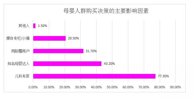 同时,根据TalkingData数据显示,母婴人群易于接受专业KOL的推荐,其中知名母婴达人的影响因素占到43.2%。