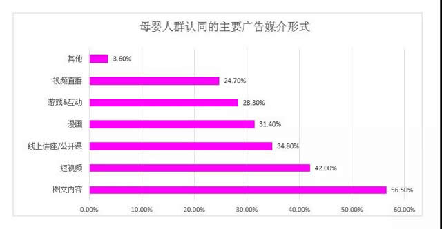 短视频的传播形式易被接受 根据《2018年母婴行业洞察》数据显示,母婴人群普遍认同图文和短视频的传播形式,其中异军突起的短视频占比高达42%。