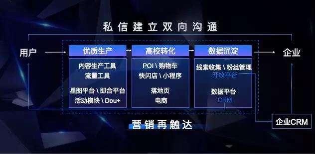 直到今年6月,抖音企业蓝V上线,意味着抖音官方将在企业营销方面提供更多赋能,令各方充满期待。 上线3个月之后才正式举办大会,可见抖音对于企业蓝V十分重视同时也比较谨慎。如今蓝V生态已初步形成,也到了进一步开放,邀请更多小伙伴一起玩的时候。 此次大会上,官方重点介绍了抖音蓝V的产品功能,以及运营策略和案例,想必是大多数营销界人士最为关心的话题。我们就来重点分析一下,抖音企业号究竟有哪些功能?能帮助企业做些什么? 正如今日头条品牌广告及创新业务总经理魏雯雯所说,抖音企业号作为一个新兴的企业自媒体阵地,从功能和价值上并不是对过去阵地的颠覆,而是一种增值。但同时,企业也不能将微博、微信的经验和内容简单迁移,而是要依据抖音平台和用户特性进行内容运营再造。 抖音企业号的功能主要可以从内容生产、促进转化、数据沉淀、双向沟通四个方面来理解。