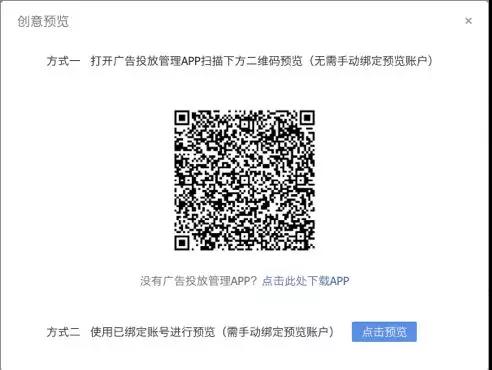 2、扫码预览 除了登录问题,是不是还在为广告预览绑定账号的麻烦操作而苦恼?作为广告主的贴心管家投放APP给您提供了完美的解决办法!只需拿起手机轻轻一扫,就可以预览广告啦! 仅需以下三步: 首先打开PC创意列表,点击小眼睛预览