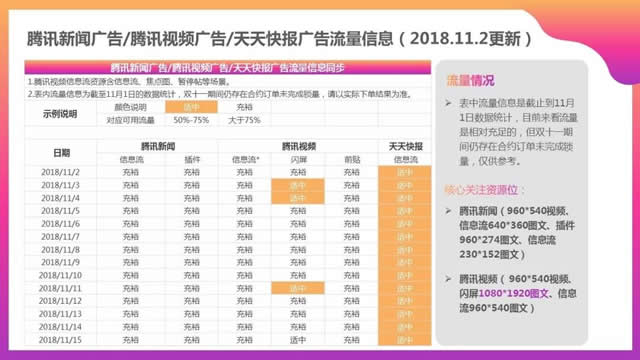 近期核心城市流量普遍紧张,朋友圈可用流量低于20%;重点城市流量普遍适中20%-50%,普通城市较充裕大于50%。微信公众号广告资源位和小程序广告资源位则可以重点关注。 2、腾讯新闻广告/腾讯视频广告/天天快报广告 竞价广告库存:双11期间稳中有升 截止到11月1号上午11点,腾讯新闻广告/腾讯视频广告/天天快报广告竞价可用库存预估如下表所示: