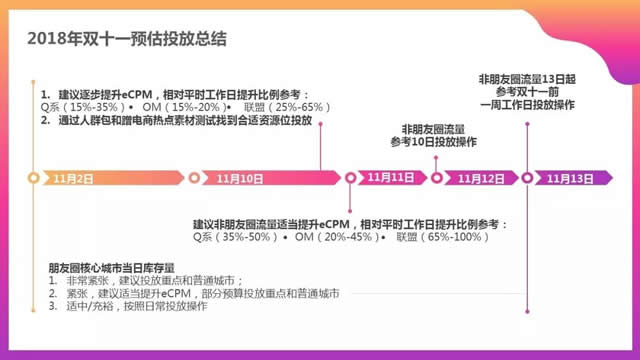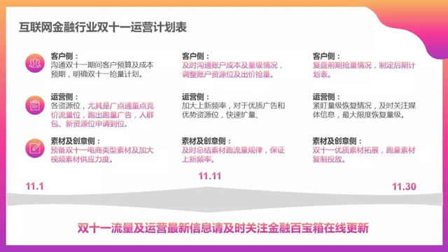 我们根据流量竞争情况设计了如下的运营计划,广告主应该及早准备好充足“弹药”,我们也会积极配合广告主投放计划加大运营支持,充分利用好双11机会。