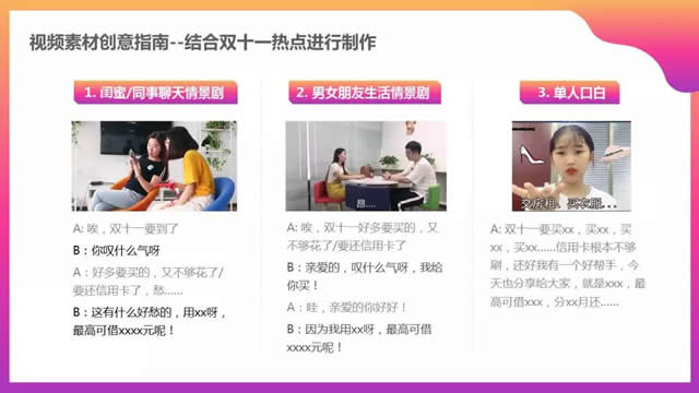 信用卡创意上,双11电商的元素一个也都不能少。如将信用卡和购物车、快递包裹放在一张素材里,可以有效激活双11期间用户的注意力,并且在信用卡消费和买买买的行为之间建立起一种连接,从而激发用户申领办卡;风格上,也可以参照双11电商大促,将红色、金色作为主色调,文案上也同样需要结合双11的场景,如: 1.攻略型 双十一来了,刷哪些卡最划算? 2.解答型 信用卡额度不够用?**银行额度高至8万,最快一天下卡! 3.悬疑型 月入三千如何买大牌包包? 4 .利诱型 **银行白金卡,积分换酒店、机票! 5.优惠型 **银行信用卡,限时分期免息!一卡在手剁手不愁! 以上就是金融行业双十一营销获客的全部内容,谢谢大家的观看。