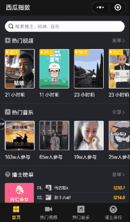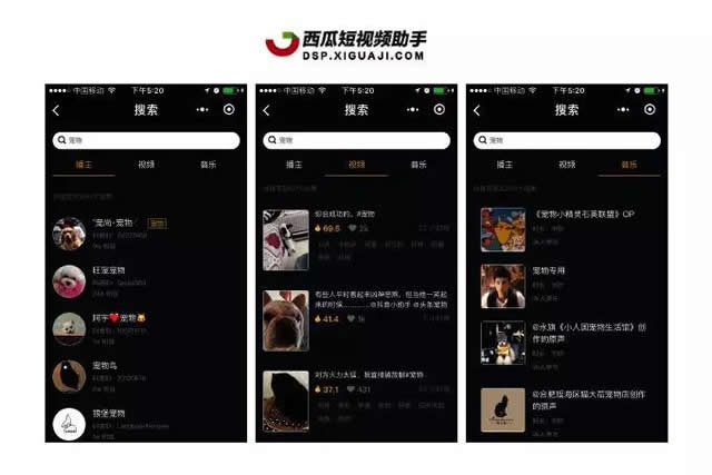 1.“抖音查找”模块:在原有播主查找的基础上,新增加视频和音乐查找两个维度,满足用户模糊查找抖音信息的需求; 2.“热门视频”模块:横向浏览的模式,让用户可以快速掌握24小时内最新上线的爆款视频素材; 3.“热门音乐”模块:也是运用横向浏览的方式,让大家了解当下最火的背景音乐素材; 4.“播主排行”模块:分别展示网红美女、网红帅哥、宠物三个综合榜单前三的西瓜指数。 对于大多数用户我们小程序抖音到底可以给大家带来什么呢? 2、快速搜索:迅速定位你所需要的抖音资源 大家用过抖音搜索功能都晓得,界面隐藏深,查找不方便;资源推荐有猫腻,企业资源优先推送,而我们抖音小程序,从用户体验出发,不仅而已通过抖音号的名称、id检索播主信息,还可以通过模糊匹配,查看对应的播主、视频和音乐,这样如果你想要了解一个类别的数据信息,就可以使用我们的快速查找完成数据收集。