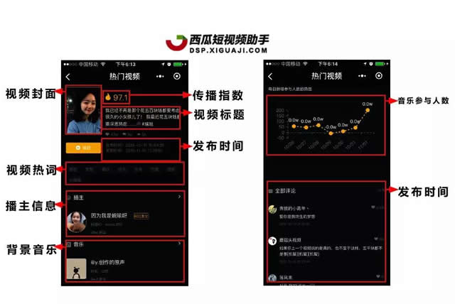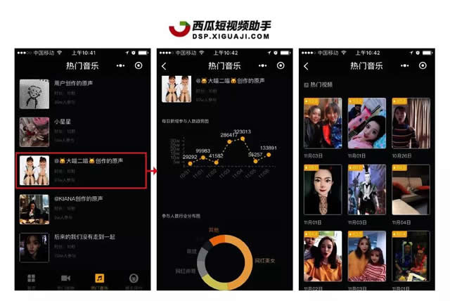 (抖音小程序热门视频界面) 进入热门视频的详情页:除了视频的相关数据外,我们可以看到发布时间、视频的热词、视频相关评论,也可以看到所用音乐的相关数据。 有了好的视频内容,搭配上热门音乐,可以大大提升你的抖音短视频爆款的几率。热门音乐为提供了“每日新增人数趋势图”和“参与人数行业分布图”。