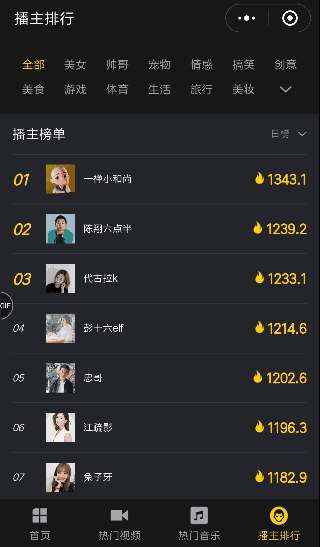 (抖音小程序热门音乐界面) 前者通过图表数据展示音乐使用人数的增减变化,运营者可以根据曲线图走势,判断是否要借势而用。后者是对使用音乐数据进行精细化分类,通过使用用户数据的类别标签分类图,我们可以判断自己借鉴的领域匹配度是否契合。 除了上述的主要用途外,热门音乐中,我们为运营者提供音乐的时长,便于运营者剪辑使用,以及提供使用该音乐的用户所拍摄的视频内容,运营者可以进一步借鉴参考。 4、播主排行:提供KOL大咖的运营方式和粉丝画像的数据库 对于大多数刚刚接触抖音运营的小白而言,向大咖学习经营之道是最佳方式之一,当然如果有线下交流经验固然好,但是想要系统了解KOL成功之道,就需要对他们对作品和发展过程有一定对了解。