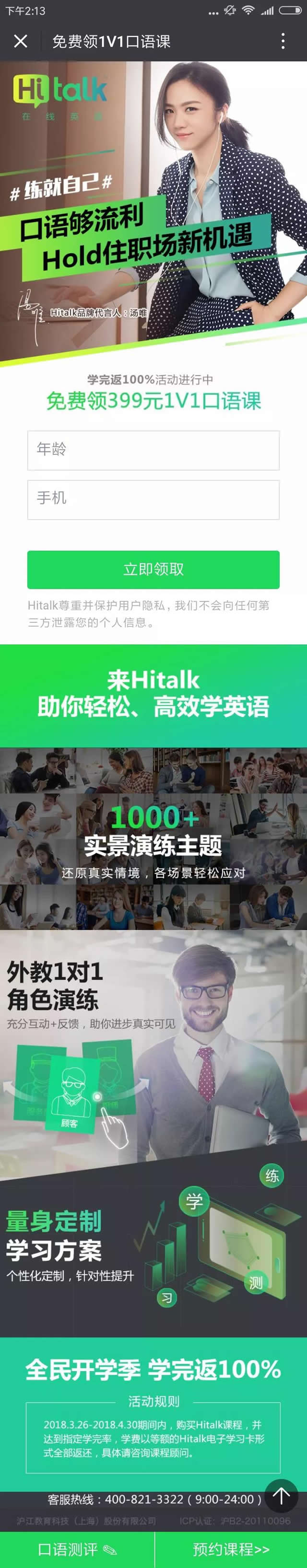 落地页逻辑及建议: 1)首屏原则:承接外层创意,罗列卖点和痛点,如免费试学,自己创业,轻松赚钱,提供就业,小班教学,学会为止等等。 2)表单逻辑:现在预约,可免费领取一套化妆课,仅限女生。制造紧张稀缺感。 3)页面逻辑: 为什么学?(比如,上班累不挣钱,想小本创业但是没有技能,想赚钱提升自己的生活,想找一份持久的事业等等)。 如何学?(通过XX平台,7天速成,学完再付钱,小班1对1,承诺学习效果,等等)。 学完有什么收获?(提供就业,辅助创业,做美妆博主等) 顾客证言(真实案例渲染氛围,XXX学员通过学习成功逆袭做老板,年入20万。XXX学员通过学习成为了一位职业美妆主,年入千万等) 立即报名(送免费体验课等) 整体建议:深挖美容培训学习的卖点,结合市场背景,不要局限于老三样,通过各种新潮的诱惑来抓住受众心理。 案例二:英语口语外教平台 品类:hi talk(英语口语外教平台) 平台:微博粉丝通