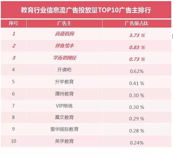 随着国内经济发展、二胎政策开放,教育市场行业市场发展进一步增长。教育行业人口技术巨大,用户生命周期循环且漫长,无论是K12教育、成人教育、语言培训、留学教育......各种细分类别层出不穷,各大教育品牌并驱争先。 随着移动互联网技术超前发展,消费者习惯的转变,教育行业广告投放重心从PC端转向移动互联网,利用背后有数据聚合支持、原生性强的信息流广告作为主流推广形式。 接下来,主要从广告主投放力度分析、媒体渠道投放情况、主要投放形式、独立案例与广告素材优化建议等方面展开洞察教育行业信息流广告的最新动向与促效方法。 1、尚德机构位列广告主投放量排行第一 教育产业链的延长扩大,行业内部出现服务细分,各个教育品牌争相涌现,根据在11月份最新的广告情报数据显示,教育行业信息流广告投放量前三位分别是尚德机构、伴鱼绘本、学而思网校。