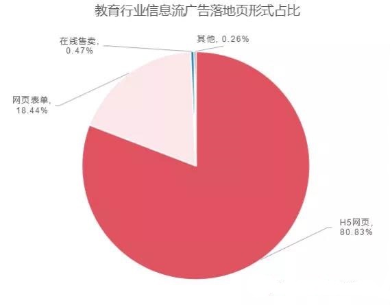 观整个教育行业信息流广告投放,以广告投放数量为渠道热度参考,“百度搜索”、“腾讯新闻”、“今日头条”这三大资讯类媒体渠道名列前三。对应用户在(精准)搜索、浏览新闻的过程中,以原生广告的设定满足其对索取(教育)资讯的诉求。 3、广告落地页形式较单一,H5网页为主流 基于投放渠道特性以及推广目的,教育行业信息流广告落地页形式较为集中与单一,以“H5网页”最为主流的落地页形式,其次“网页表单”为辅助落地页形式。