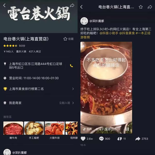 POI详情页有两个部分构成,上面部分是对信息的介绍,城市、美食或景区,可以让商家通过认领专属地址,构建品牌虚拟店铺,成为网红打卡地。 今年国庆,抖音和快乐柠檬做了一个尝试,打通了线下210家门店,推出一款定制奶茶。