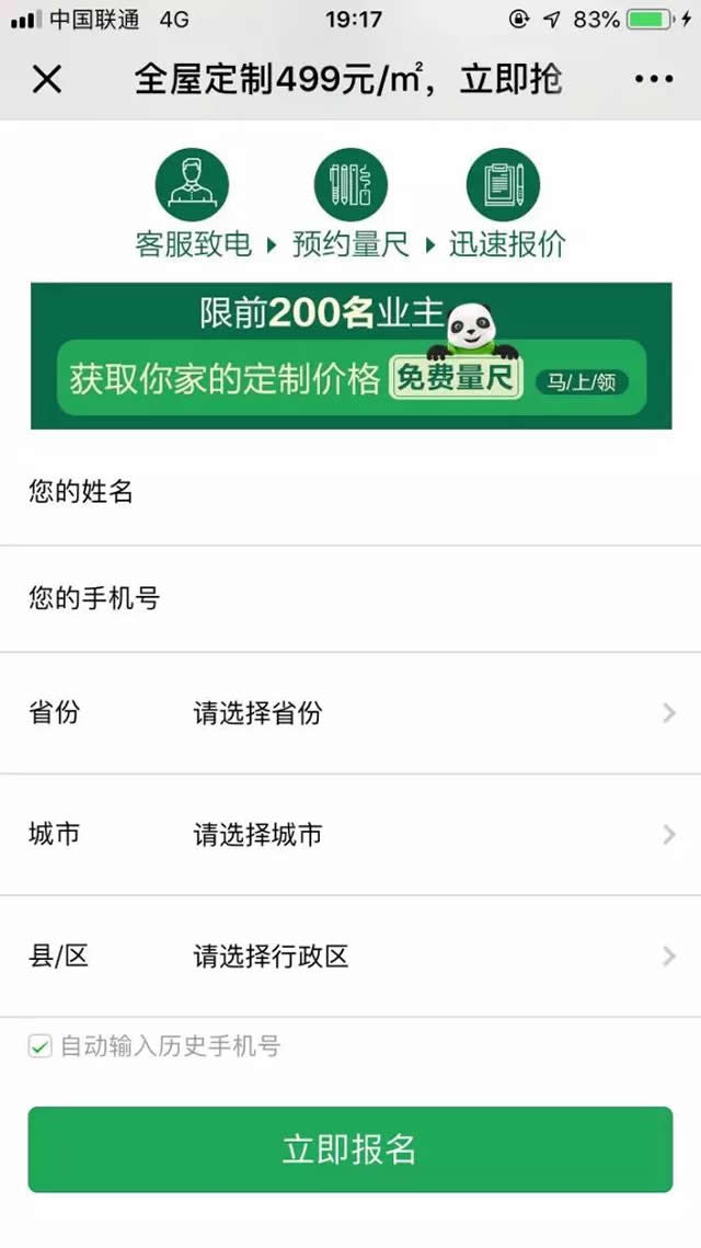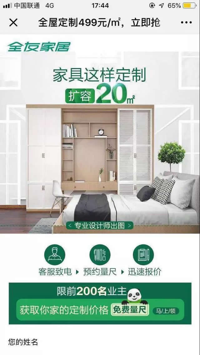 8月-10月是家居行业旺季,全友家居通过1个月的全方位调整准备,收获了十分亮眼的效果: 1、曝光量24,681,241次 2、客资成本稳定并呈下降趋势,客资量级稳步上升 3、品效合一,微信指数位于行业前列 拥有一个温馨舒适的家是每个人的向往,但选购一套集颜值、功能、环保于一身的全屋家具却让很多人无从下手。怎样避免劳心劳力的挑选过程,而只享受令人愉悦的结果呢?针对这种需求,全屋定制服务应运而生。 全友家私就是这样一家能为家庭提供综合家居产品和定制服务解决方案的公司,30年来,以“绿色、环保”为品牌核心价值,以“年轻、时尚”为品牌个性,以“熊猫”为品牌代言,以“绿色全友、温馨世界”为品牌诉求,成为了大量消费者的不二选择。 互动、认知双提升:素材测试+高识别度设计 直击用户痛点的设计素材是有效吸引用户点击的重要因素之一,在此次推广前期,优化师根据全屋定制用户特点以及全友家居的服务特性,列出了5个消费者诉求,进行测试投放,发现根据“空间扩容、0元设计”这2个诉求制作的广告素材具有更优的投放效果,尔后持续使用该系列素材进行投放,收获了令人满意的点击率。