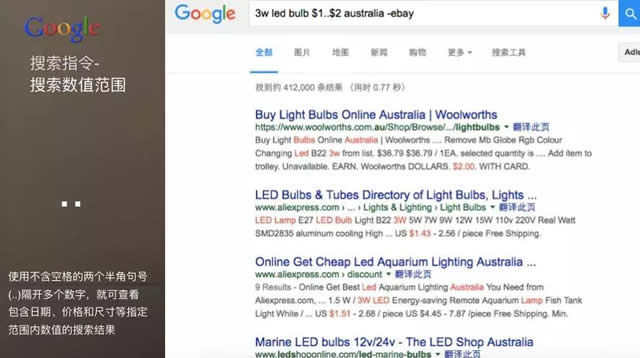好,我们再看Google搜索的一个案例,那么在这个案例里面,我们用了3瓦LED灯泡,1澳元到2澳元之间,在澳大利亚不要看eBay的结果。如果我们需要这样输进去,它整个解析就是这个意思了,那么这一个板块,主要是用在范围。