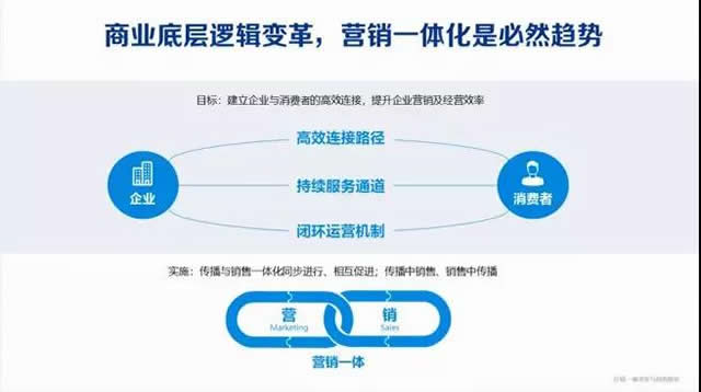 营销一体化时代来了,品牌营销的思路也该升级了。 日前,国家广告研究院与中国传媒大学广告学院联合发布了《2018新营销白皮书——营销一体化变革与趋势探索》报告。报告中宣布“商品经济正在向资产经济”转型。 “营销一体化”的时代已经来临。底层商业逻辑发生了如下变化: 1.以商品为中心的定位向以用户为中心定位的转变。 2.以商品售卖、单次价值挖掘为重点向商品服务化、资产化持续运营转变。 3.以销售增量、不断扩展市场份额为目标向存量闭环、挖掘全周期用户价值为目标转变。 报告指出“营销一体化实施中强调传播和销售同步进行、相互促进,传播销售化、销售传播化。通过构建用户连接关系,企业在用户增量获取、存量激活、闭环经营方面将获得有力抓手。”