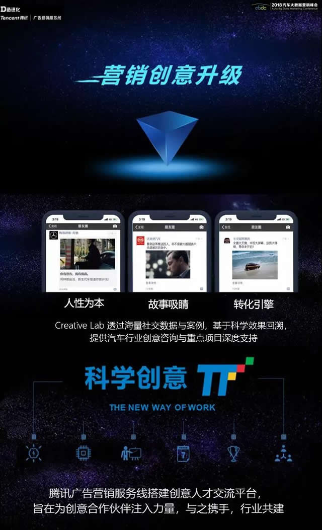营销洞察升级 对于洞察,建议行业“以终为始”:“洞察服务于营销,最终目标是提升品牌的‘社交能’——社交环境下营销对目标群体的影响力。 为此,腾讯广告营销服务线从三个步骤入手。首先是洞察和算法技术的进化,然后是在此基础上去深化对受众的全方位洞察,最后是在营销全视角上的优化,包括对市场和用户的理解,营销和媒介策略及创意内容的指引,还有在投放执行和效果衡量上的优化。可以将其总结为“从底层的技术,串联整个营销链路,直到最终的社交结果。” 营销效能升级 腾讯广告营销服务线对于营销效能的升级,体现在三个方面。 1、丰富场景和形态的流量产品,提供便捷的互动转化体验。“腾讯系产品占据中国网民55%的移动互联网使用时间,这是腾讯的核心能力之一。” 2、丰富的技术产品。“腾讯一直在推动服务的产品化。包括程序化创意、腾讯优图、oCPM/oCPA、潜客优选等产品,都得到广泛应用。通过技术产品,使腾讯广告营销服务线的技术能力贯穿线上、线下营销链路,提升营销效率。 3、腾讯广告营销服务线还与车慧共同沉淀洞察能力,协同彼此营销效能以驱动增长。 营销创意升级 目前汽车行业的创意素材同质化还比较明显,存在很大提升空间。“单个‘惊世之作’可以依靠可遇不可求的灵感,但整体创意水平的提升需要依靠科学的洞察。”为此,腾讯广告营销服务线提供了不同的创意支持体系。 1、Creative Lab 透过海量社交洞察与案例,基于科学效果回溯,提供汽车行业创意咨询与重点项目深度支持。 2、科学创意π 搭建创意人才交流平台,为创意合作伙伴注入力量,共建创意生态。