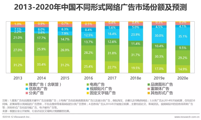 中国网络广告分形式市场份额 2018年信息流广告市场份额预计将增至24%,位列第三 因为信息流广告的崛起,中国不同形式的网络广告市场份额不断调整。2017年起,信息流广告市场份额超过品牌图形广告,跃居第三,而传统搜索广告的市场份额持续萎缩。