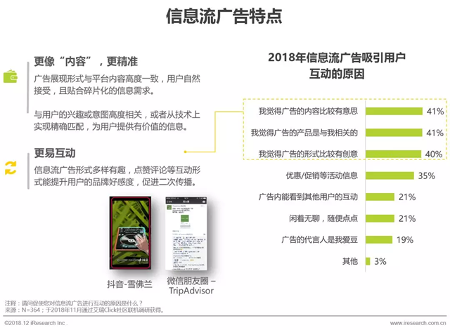 信息流广告特点 更像“内容”,更精准,易互动,广传播 信息流广告之所以受到用户和广告主的双重青睐,其优势在于自然地融合于平台内容,与用户的兴趣点或者意图高度相关,以不破坏用户体验的姿态激发用户兴趣。此外,富有创意的内容能更进一步吸引用户互动,实现品效合一。