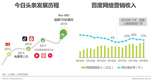 信息流广告的巨头之争 今日头条的先发优势和百度的“二次生长” 信息流广告硝烟弥漫,今日头条、百度和腾讯成为第一梯队的三大玩家,而18年初的“百头大战”显示巨头混战再度升级。 对比来看,今日头条信息流广告起步早,且内容分发矩阵构建完全;而百度从搜索到“搜索+信息流”双引擎的及时转型,使其网络营销收入增速开始回升,2018Q3仍保持12%的同比增速,其中信息流即是营收增速的一大亮点。
