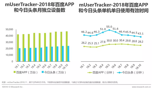 百度月独立设备数10月达到4.7亿,头条用户粘性优势明显 从平台数据对比来看,百度APP拥有显著的用户规模优势,而今日头条胜在用户粘性,18年月均单机单日使用有效时间高达48分钟,对于以内容形式传播的信息流广告而言,优势显著。