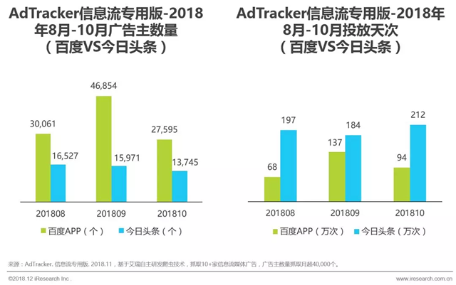 百度信息流广告的广告主数量优势明显 2018年9月,百度信息流广告主数量高达46,854个。但从投放天次来看,今日头条的广告主虽然数量不如百度,但整体投放更频繁。